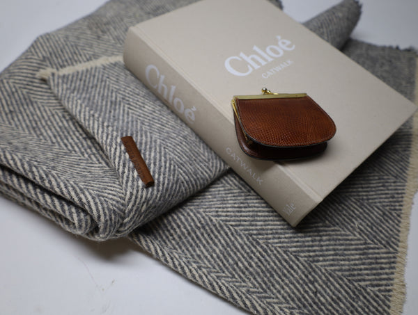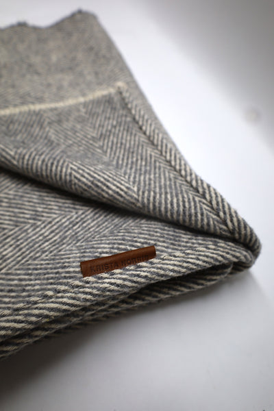 This version of our Annie is a long, oversized classic straight scarf. A wool blend classic herringbone in light grey. 20" x 80" - Wool Blend - Leather Label
