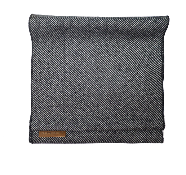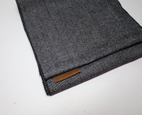 A classic men's scarf in Black/Grey Tweed wool in a traditional, thin, straight style. Unisex. 15" x 80"