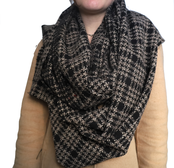 This is our Victoria Wingtip Scarf. A traditional Glen houndstooth wool weave, this is our Wingtip style with a split seam infinity. Wool and mixed fibre blend. Sewn in Canada....