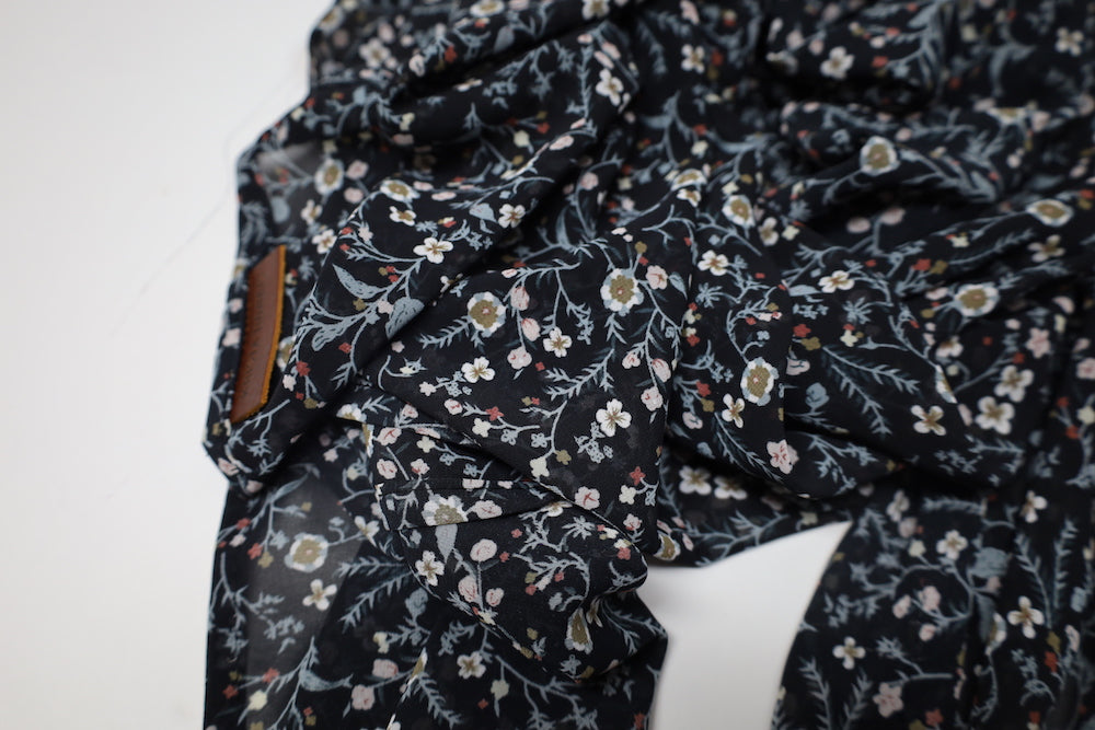 This square neck scarf in a light chiffon and Ivy floral pattern pairs well with a leather coat, jean jacket, or pea coat.